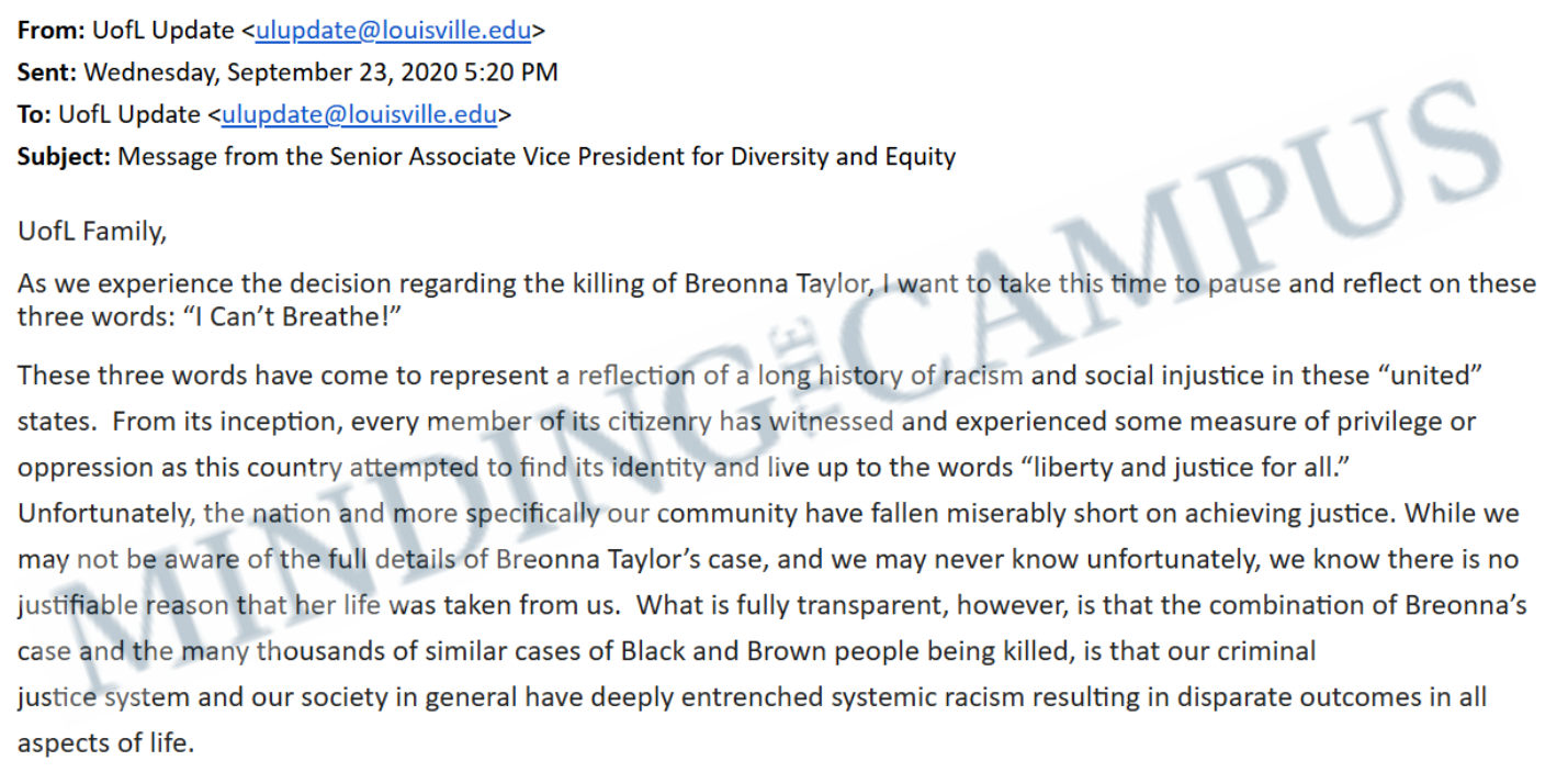 For example, UofL hosted an open session immediately after the 2016 election to help people process the so-called trauma of Donald Trump’s victory, which was attended by hundreds of students, faculty, and staff. It did the same in response to the death of George Floyd. And, following the grand jury decision not to indict any Louisville police officers in the death of Breonna Taylor, UofL Senior Associate Vice President for Diversity and Equity, V. Faye Jones, sent an email to the entire campus community, asking everyone to reflect on the words, “I Can’t Breathe!” She also used the occasion to perpetuate the notion that the criminal justice system targets racial minorities, a claim that stokes division rather than truth and stands at odds with the data.