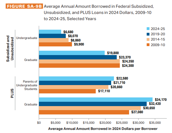 - Undergraduates have been borrowing less over time, whereas graduate students have been borrowing more.