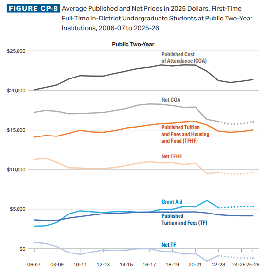 - We’ve had free community college—on average—for around 17 years now. Note the Net TF line below, which shows net tuition and fees after accounting for grant aid.
