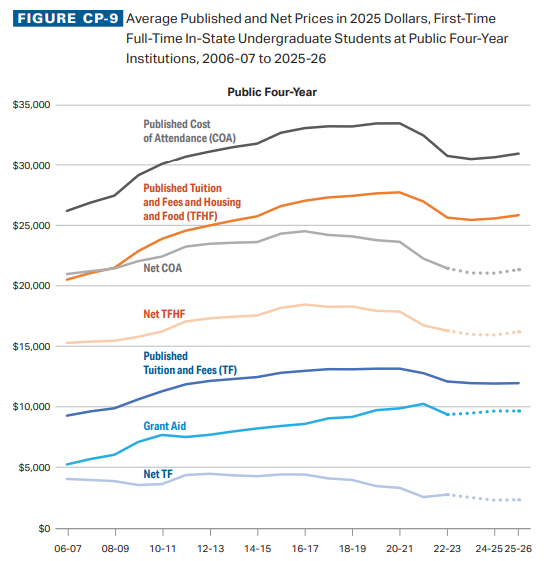 - Net tuition, which accounts for grant aid, continues to fall at four-year public colleges. This figure peaked at $4,400 in 2015-16 and has since fallen to $2,300.